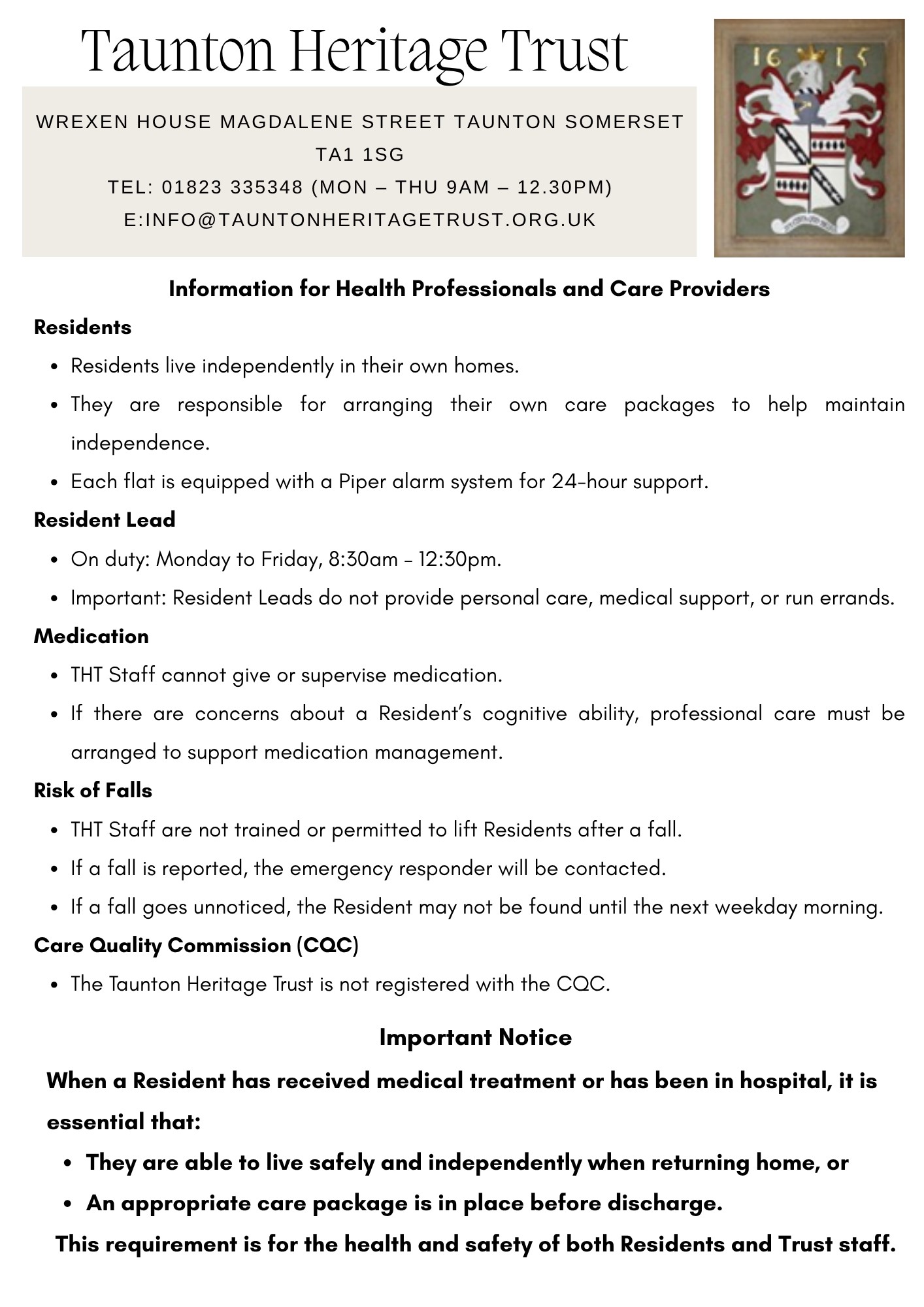 We have a part-time onsite Resident Lead and each of our flats is fitted with a 24 hour piper alarm system.
